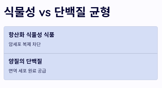 - 항암 성분이 풍부한 식물성 식품과 기초 체력을 지탱하는 단백질의 균형이 중요합니다.