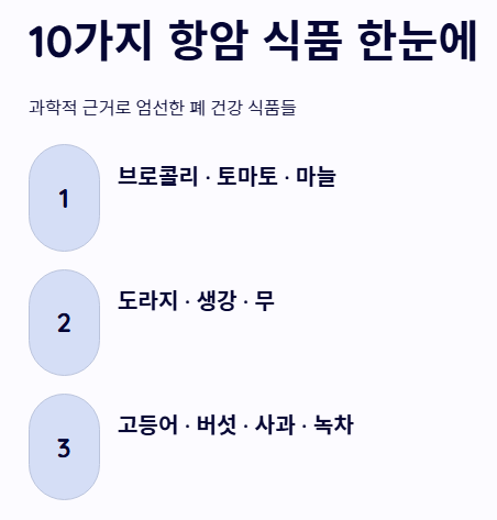 - 폐암에 좋은 음식 10에는 브로콜리, 토마토, 도라지, 마늘 등 항산화와 해독에 탁월한 식품들이 포함됩니다.