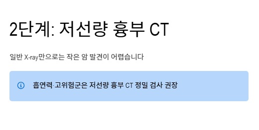 - 관점 B: "고위험군 대상의 집중적이고 정밀한 타겟 검진이 효율적이다" 30년 이상 매일 한 갑 이상의 담배를 피운 고위험군에게 검진 자원을 집중하여 효율적으로 폐암 초기증상을 잡아내야 한다는 시각입니다. 과잉 진단으로 인한 심리적 불안보다 실질적인 위험도가 높은 집단의 관리에 집중하자는 논리입니다.