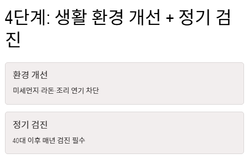 - 금연과 환기 등 생활 습관의 변화가 가장 강력한 예방법입니다.
