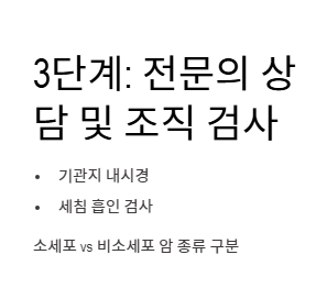 영상 검사에서 이상 소견이 발견되면 기관지 내시경이나 세침 흡인 검사를 통해 암세포를 확진합니다. 이는 폐암 초기증상을 확진하고 암의 종류(소세포, 비소세포)를 구분하는 핵심 과정입니다.