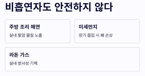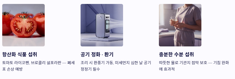 - 공기 정화와 환기: 실내 조리 시 반드시 환풍기를 켜고 미세먼지가 심한 날에는 공기청정기를 가동하세요. 깨끗한 공기는 폐암 초기증상 유발 요인을 차단하는 가장 기본입니다.