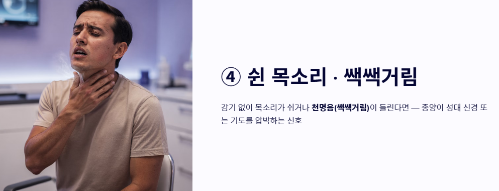 - 쉰 목소리와 쌕쌕거림: 감기도 아닌데 목소리가 쉬어서 돌아오지 않거나 숨을 쉴 때 쌕쌕거리는 천명음이 들린다면 종양이 성대 신경이나 기도를 압박하는 증상일 가능성이 큽니다.