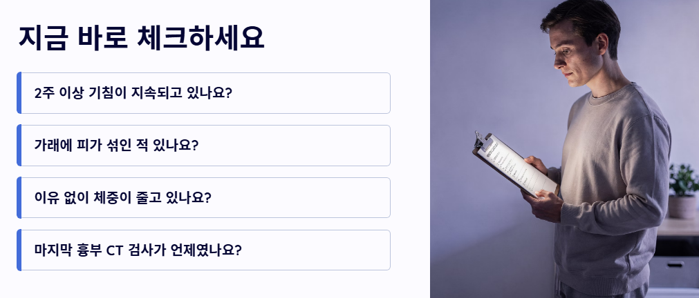 - 2주 이상 지속되는 마른기침: 감기약이나 기침약을 복용해도 낫지 않고 2주 이상 계속되는 기침은 가장 흔한 증상입니다. 평소와 다른 기침 소리가 난다면 즉시 확인이 필요합니다.