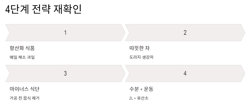 - 항산화 식품 섭취와 따뜻한 차 마시기를 생활화하는 4단계 전략이 필요합니다.