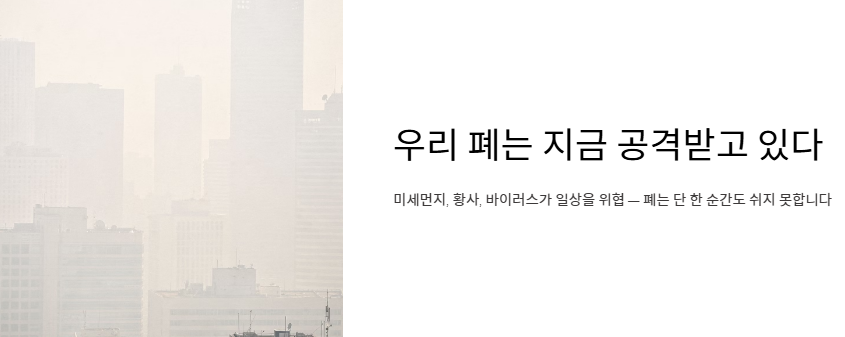 "매일 마시는 공기가 예전 같지 않다고 느껴지시나요? 미세먼지와 황사, 그리고 각종 바이러스가 일상을 위협하는 요즘, 우리 몸의 필터인 '폐'는 단 한 순간도 쉬지 못하고 공격받고 있습니다."