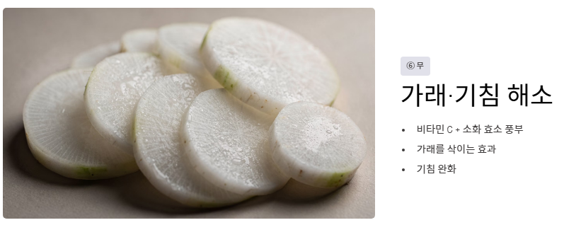 - 무: 비타민 C와 소화 효소가 풍부해 가래를 삭이고 기침을 멎게 하는 데 효과적입니다.