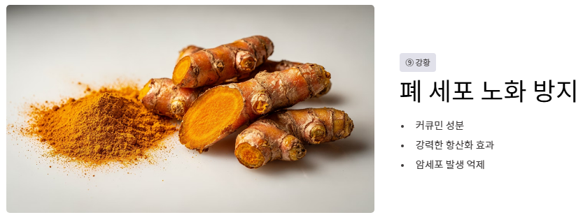 - 강황: 커큐민 성분의 강력한 항산화 효과가 폐 세포의 노화를 막고 암세포 발생을 억제합니다.