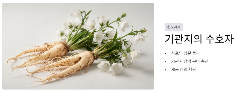 - 도라지: 사포닌 성분이 풍부해 기관지 점액 분비를 돕고 세균 침입을 막아줍니다.