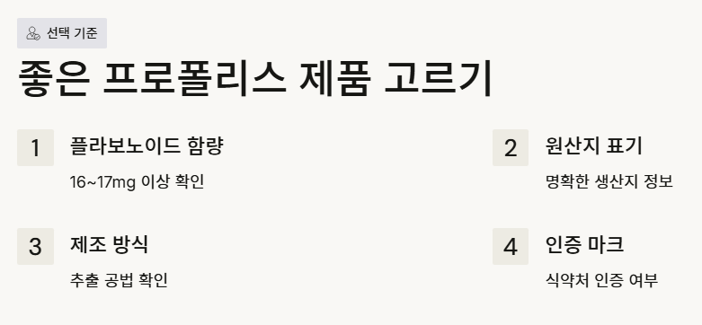 - 선택 기준: 플라보노이드 함량을 반드시 체크해야 진정한 프로폴리스 효능을 누릴 수 있습니다.