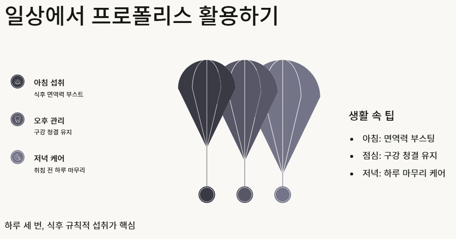 - 구강 건강 증진: 구내염이나 잇몸 질환 완화에 도움을 주는 프로폴리스 효능이 잘 알려져 있습니다.