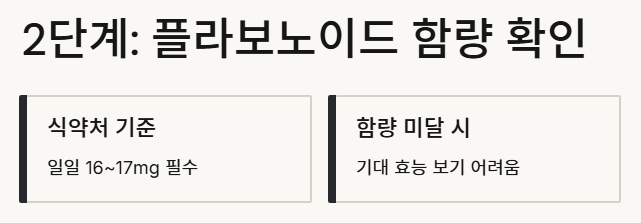 프로폴리스 효능의 핵심은 플라보노이드입니다. 식약처 기준 일일 섭취량인 16~17mg을 충족하는지 확인하세요. 함량이 기준치에 못 미치면 기대했던 프로폴리스 효능을 보기 어렵습니다.