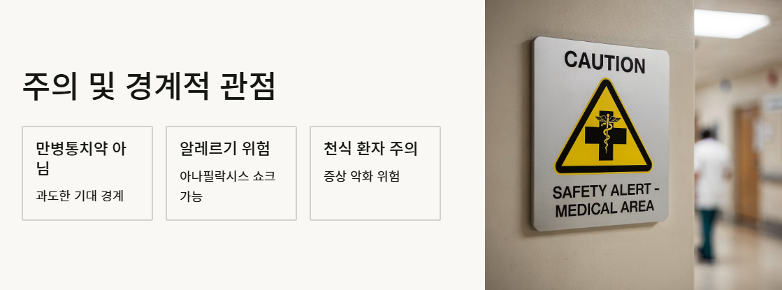- 주의 및 경계적 관점 (과잉 섭취 금지): 일부 전문가들은 프로폴리스 효능이 만병통치약처럼 인식되는 것을 경계합니다. 꿀이나 꽃가루 알레르기가 있는 사람에게는 프로폴리스 효능이 오히려 아나필락시스 쇼크를 유발할 수 있기 때문입니다. 또한, 천식 환자에게는 프로폴리스 효능보다 증상 악화의 위험이 클 수 있다는 점을 지적하며 신중한 접근을 강조합니다.