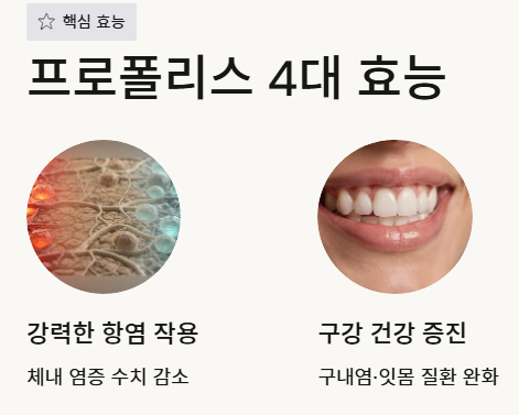 - 주요 이점: 항균, 항염, 항산화 작용을 통한 면역력 증진이 프로폴리스 효능의 핵심입니다.