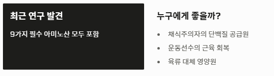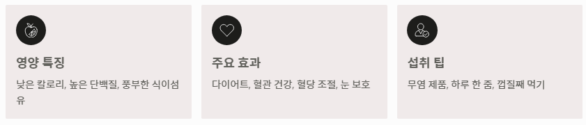 - 영양 특징: 낮은 칼로리, 높은 단백질, 풍부한 식이섬유와 항산화 성분.