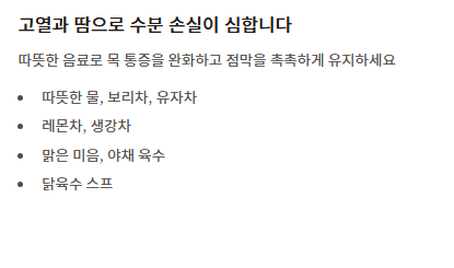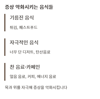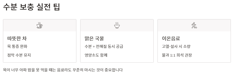 - 따뜻한 물, 보리차, 유자차, 레몬차: 목 통증 완화와 점막 수분 유지에 도움