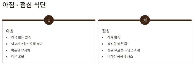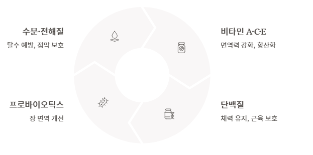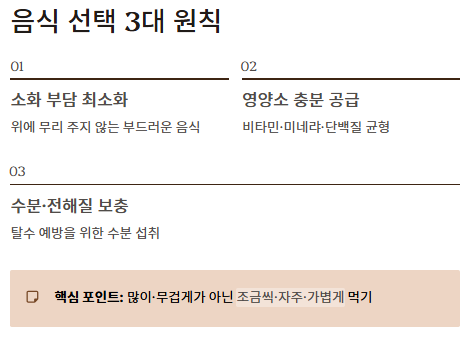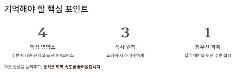 - 맑은 국물: 미음, 야채 육수, 닭육수 등은 수분+전해질을 함께 공급