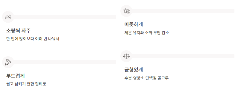 - 소화가 잘 되고 위에 부담을 주지 않을 것
