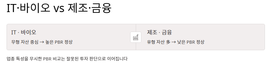 pbr 이란 지표는 산업군마다 기준이 다릅니다. 제조업이나 금융업은 자산이 많아 PBR이 낮은 경향이 있고, IT나 바이오 산업은 무형 자산 중심이라 PBR이 높게 형성됩니다. 따라서 동일 업종 내에서 상대적으로 낮은 pbr 이란 값을 가진 종목을 찾는 것이 더 현명한 접근입니다.