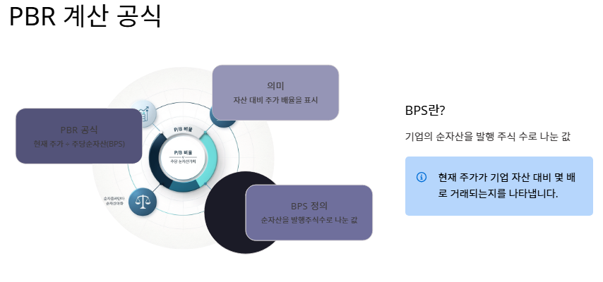 - 계산 방식: 주가를 주당순자산(BPS)으로 나누어 산출합니다. 즉, 현재 주가가 기업이 가진 자산에 비해 몇 배로 거래되고 있는지를 나타냅니다.